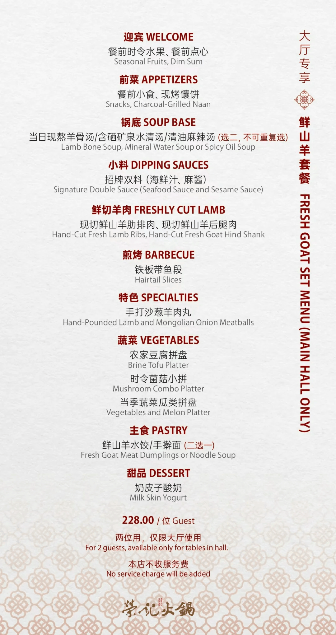 此次推出的小火锅包含两款主打套餐:小海鲜套餐与鲜山羊套餐。其中,小海鲜套餐提供3人餐和4人餐两种规格,3人餐采用按位计价,每位398元;4人餐为套餐制,整套定价2932元。相比之下,鲜山羊套餐价格更为亲民,定价228元/位,两位共用。